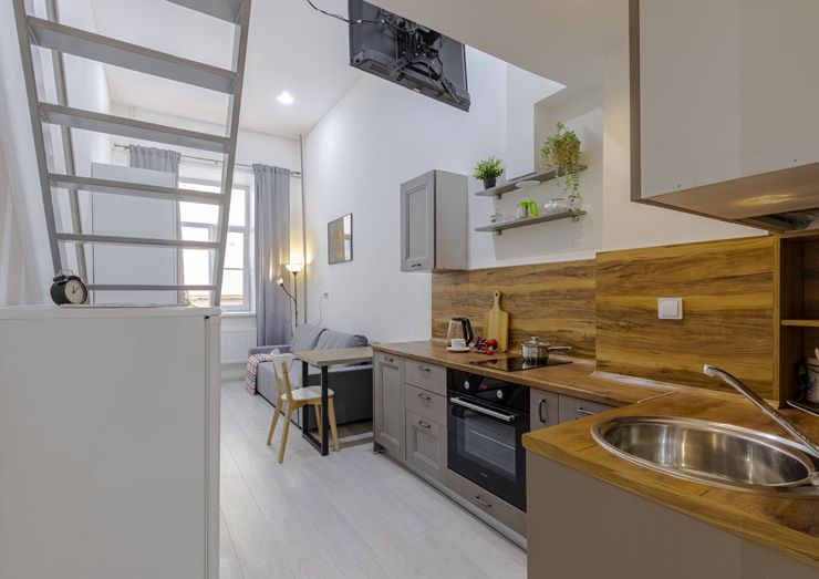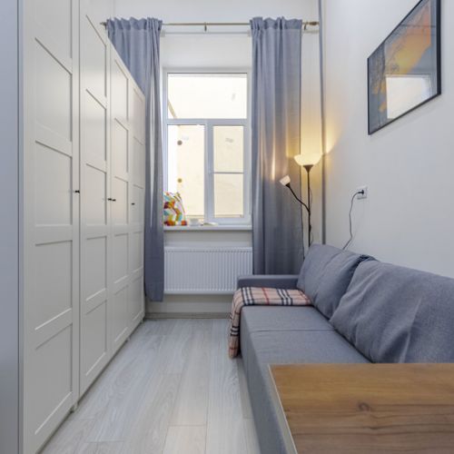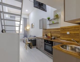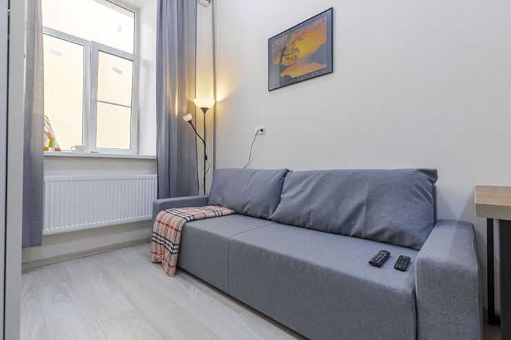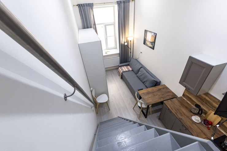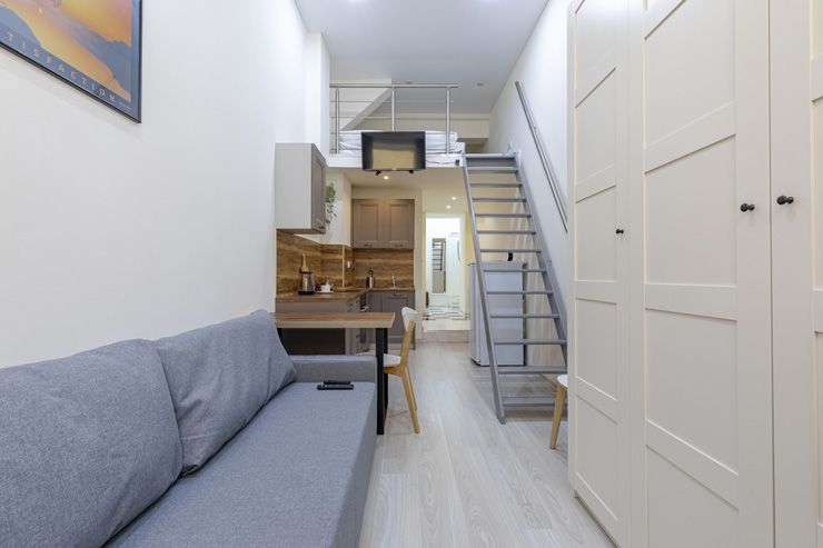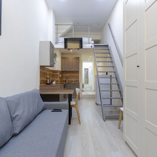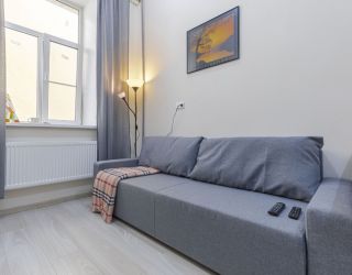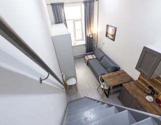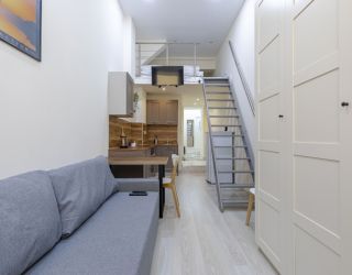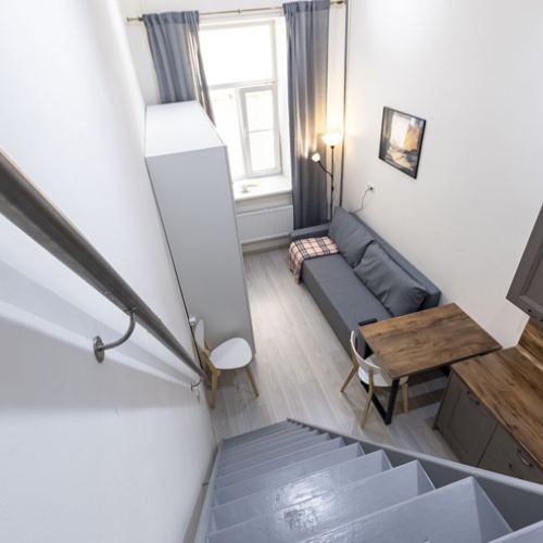Стильная и современная двухуровневая студия с интерьером в сдержанной цветовой гамме находится в бывшем доходном доме Тишиной-Ростовцовой. Апартаменты подготовлены для отдыха 4 гостей: на первом ярусе установлен раскладывающийся диван, на втором обустроены спальные места для двоих. В компактной, но функциональной кухонной зоне есть все, что может пригодиться при приготовлении еды, а также встроена посудомоечная машина. В санузле в наличии душевая и стиральная машина. Возможно подключение к Wi-Fi. Разрешен заезд с питомцем.